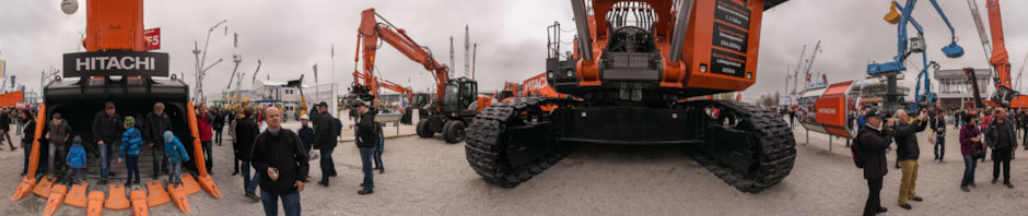 Every third year the world’s largest fair – the bauma – takes place in Munich. This panorama has been taken just below the boom of a “Hitachi 2600 Ex-6”.