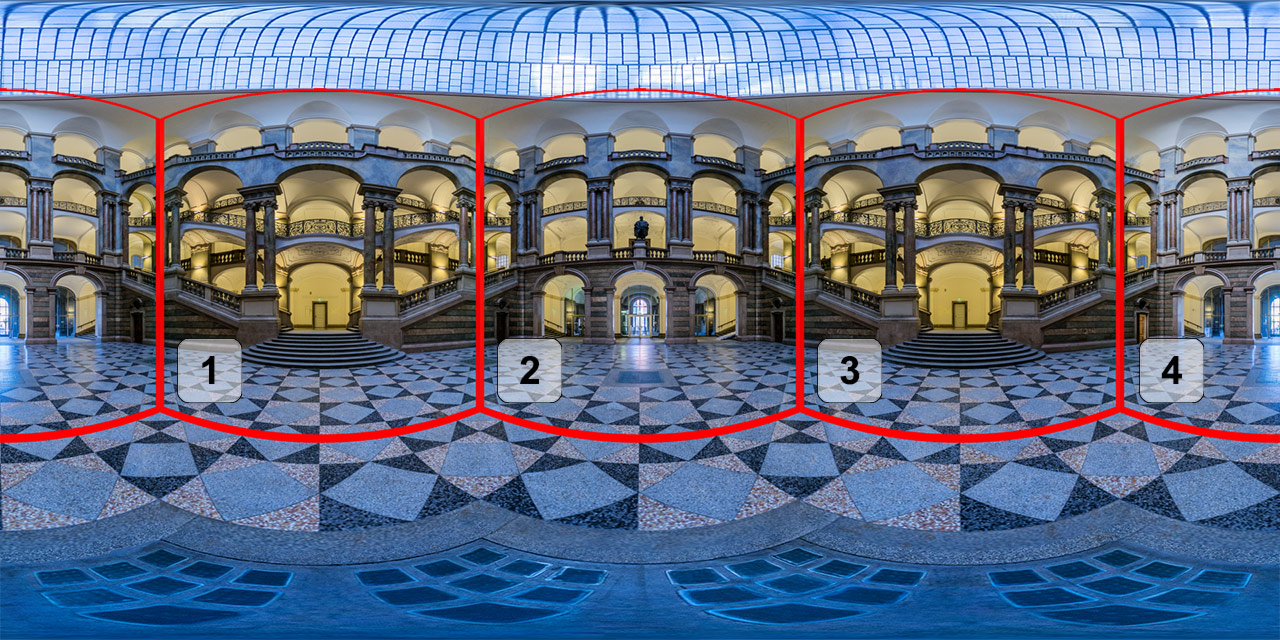 The following image shows the four cube faces reprojected back onto the equirectangular image. You can see here clearly why the floor tiles are not curved in the final Cube Face Panorama. You can also see that the cube faces are not really cube faces, because I moved the individual cubes faces towards the zenith to see less of the floor and more of the ceiling.